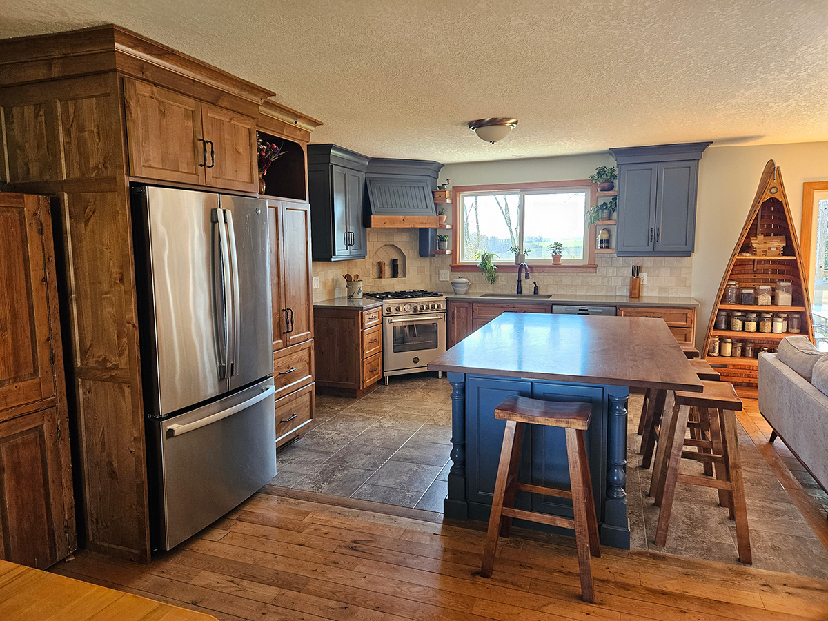 Beautiful custom cabinetry work completed by C&G Custom Cabinets help create the rustic country kitchen backdrop our customers were looking for. A tired old pink brick fireplace have been replaced with an exquisite natural stone hearth, barn beam mantle and enclosed wood stove.